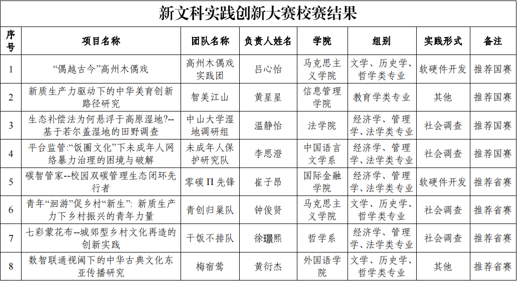 根据全国新文科教育研究中心和大学生新文科实践创新大赛组织委员会《关于举办2025年大学生新文科实践创新大赛的通知》、广东省大学生新文科实践创新大赛组织委员会《关于举办广东省2025年大学生新文科实践创新大赛的通知》,我院承办并组织开展了2025年大学生新文科实践创新大赛校赛。经组织报名、形式审查、专家评审、现场答辩等环节,共39个项目参加了校赛,其中8个项目入选晋级赛(国赛、省赛)推荐名单,现将推荐结果予以公示: