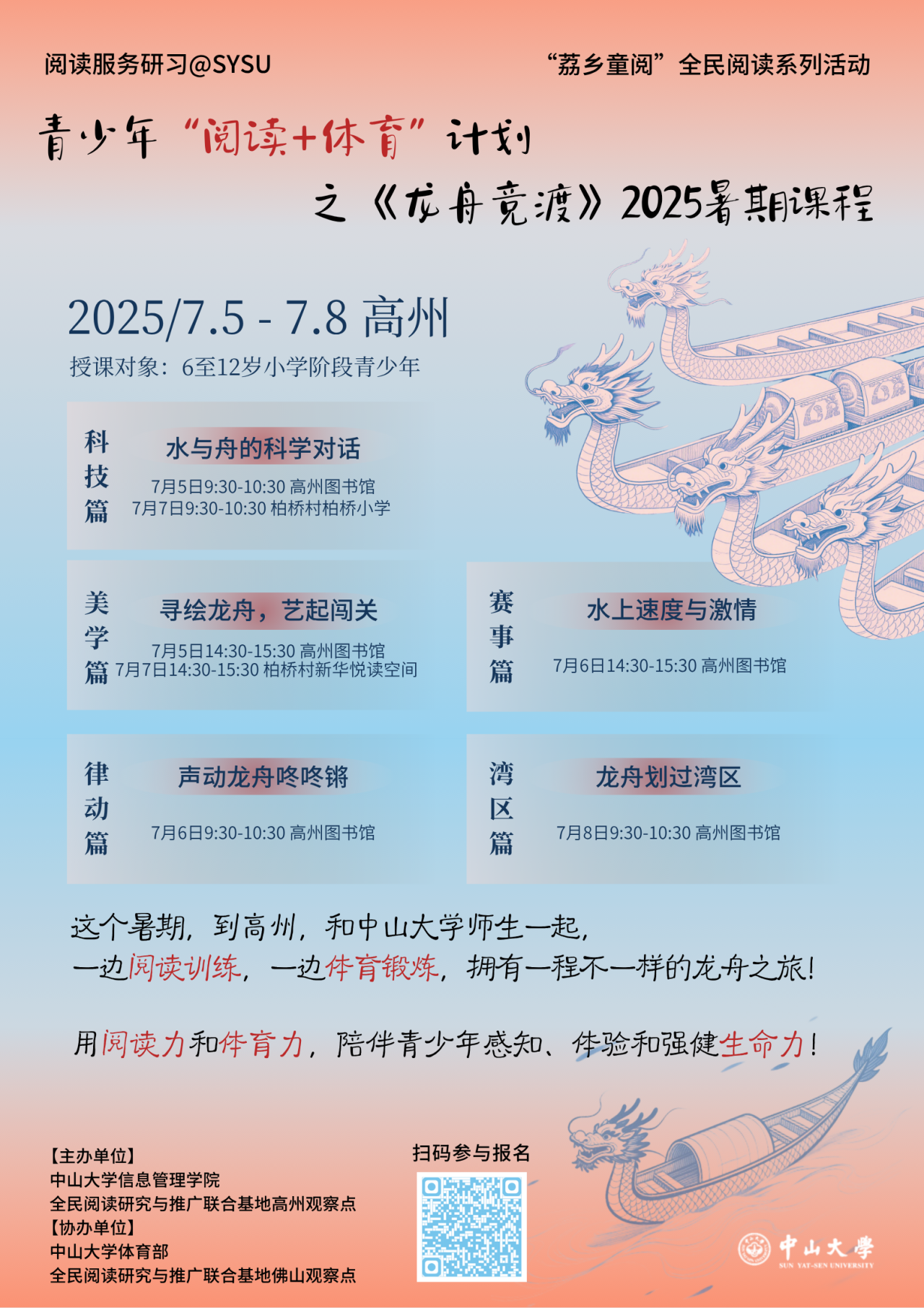 体育部张新萍教授、屈萍副教授、孙国栋副教授、孙新智老师的指导和帮助下,来自我院2022级和2023级的6位博硕士研究生助教和26位本科生同学将于今年夏天在高州面向不同年龄段的儿童和家长推出五组七场阅读推广活动,围绕科技、美学、律动、赛事、湾区五大篇章展开。