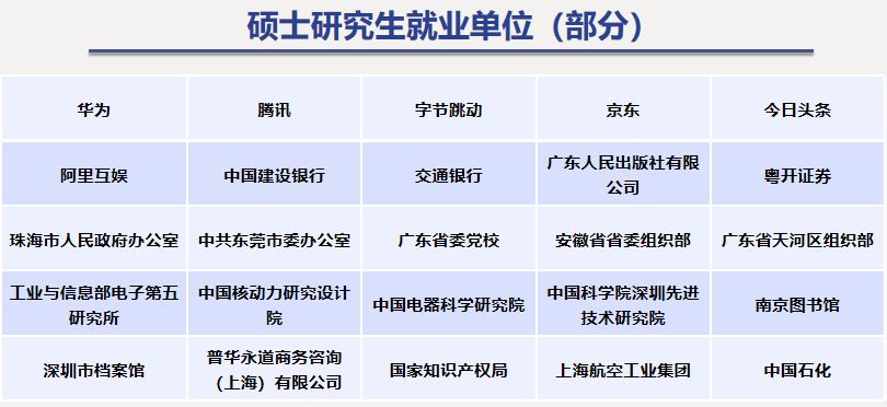 毕业生就业行业广泛,就业单位分布在教育、软件和信息技术服务业等30余个行业内,与成人色情小说 专业和学科具有广泛应用性的特点表现出一致性。其中,2024届硕博毕业生98人,毕业去向落实率100%,且就业地集中在粤港澳大湾区,具有明显竞争优势。